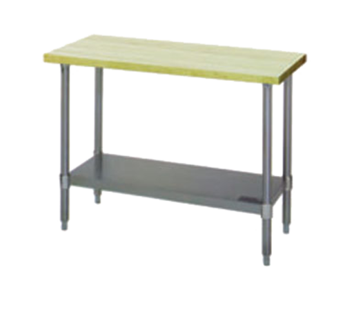 Work Table, wood top, 96"W x 30"D, 1-3/4" thick hardwood top, stainless steel gussets, stainless steel undershelf & tubular legs, adjustable stainless steel bullet feet, NSF