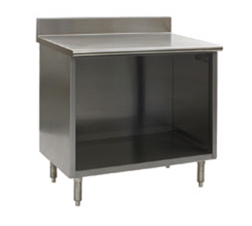 Spec-Master® Series Work Table, cabinet base with open front, 96"W x 24"D, 4-1/2"H backsplash, 14/304 stainless steel top, rolled front edge, Uni-Lok® gusset system, stainless steel cabinet body, legs, & adjustable bullet feet, NSF