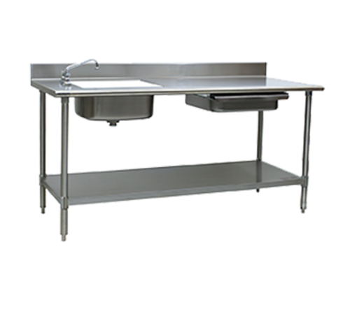Spec-Master® Series Work Table With Prep Sink, 84"W x 30"D, 4-1/2"H backsplash, 14/304 stainless steel top, rolled front edge, 20'W x 16"D front-to-back x 8" deep sink bowl on left with deck mount gooseneck faucet, 20" x 20" x 5" stainless steel drawer mounted on right, includes 1/2" thick polymer cutting board/sink cover, adjustable stainless steel undershelf, Uni-Lok® gusset system, stainless steel legs & adjustable bullet feet, NSF