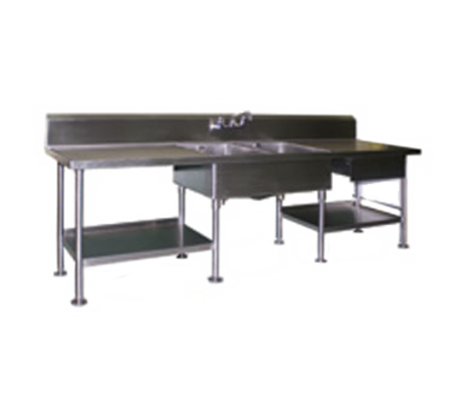 Spec-Master® Marine Prep Table, with sinks, 96"W x 30"D, 14/304 stainless steel top, 10"H backsplash, box marine edge on front & sides, (2) 18"W x 24" front-to-back x 12" deep sink bowls with twist handle drains & overflow, 8"OC splash mount T&S faucet, drawer with integrated pull flange, 1/2" thick poly cutting board with set of slides welded to outside of unit, 304 stainless steel undershelf with 1-1/2"H rear up-turn, Uni-Lok® gusset system, includes Z-clip wall mounting bracket, stainless steel legs & adjustable flanged feet, NSF