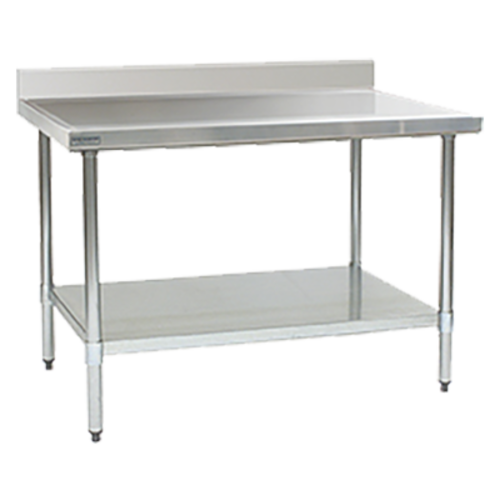 Spec-Master® Marine Series Work Table, 120"W x 24"D, 4-1/2"H backsplash, 14/300 series stainless steel top, box marine edge on front & sides, adjustable galvanized undershelf, Uni-Lok® gusset system, (6) galvanized legs with adjustable plastic bullet feet, NSF