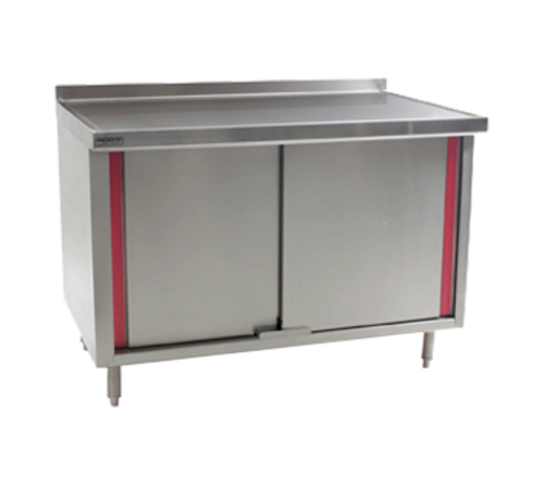 Spec-Master® Marine Series Work Table, cabinet base with hinged doors, 72"W x 30"D, 1-1/2"H rear up-turn, 14/304 stainless steel top, marine edge on front & sides, (2) hinged doors, Uni-Lok® gusset system, stainless steel cabinet body, legs, & adjustable bullet feet, NSF