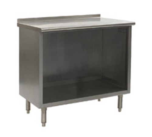 Spec-Master® Series Work Table, cabinet base with open front, 96"W x 30"D, 1-1/2"H rear up-turn, 14/304 stainless steel top, rolled front edge, Uni-Lok® gusset system, stainless steel cabinet body, legs, & adjustable bullet feet, NSF