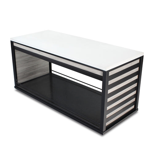 Fiji Action Station (Elite), 84-1/2"W x 30"D x 36"H, recycled glass countertop, wood veneer panels with steel slats, removable front privacy panel, gallery rails, steel frame