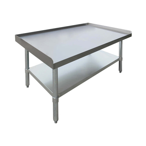 Equipment Stand, 48"W x 24"D x 24"H, rectangular, 500 lb. capacity, 2"H up-turn on sides & rear, 18-gauge 430 stainless steel top shelf, 18-gauge galvanized steel adjustable undershelf, adjustable plastic bullet feet, NSF