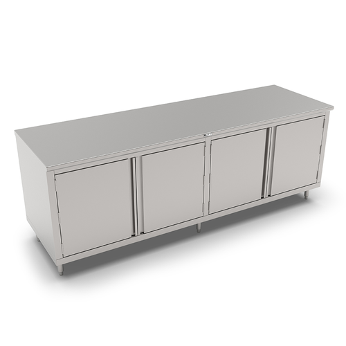 Work Table, cabinet base with (2) sets of hinged doors, 96"W x 30"D, 14/300 stainless steel flat top, Stallion Safety Edge front, 18/430 stainless steel wrap, stainless steel legs with adjustable feet, NSF