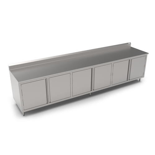 Work Table, cabinet base with (2) sets of hinged doors, 132"W x 36"D, 14/300 stainless steel top with 5" backsplash, Stallion Safety Edge front, 18/430 stainless steel wrap, stainless steel legs with adjustable feet, NSF