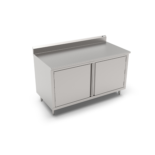 Work Table, cabinet base with (2) sets of hinged doors, 72"W x 36"D, 14/300 stainless steel top with 5" backsplash, Stallion Safety Edge front, (1) midshelf, 18/430 stainless steel wrap, stainless steel legs with adjustable feet, NSF