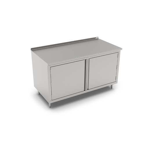 Work Table, cabinet base with (2) sets of hinged doors, 72"W x 30"D, 16/300 stainless steel top with 1-1/2" rear up-turnp, Stallion Safety Edge front, 18/430 stainless steel wrap, stainless steel legs with adjustable feet, NSF