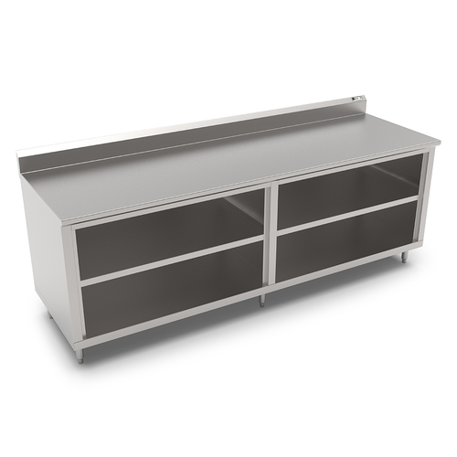 Work Table, cabinet base with open front, 108"W x 30"D, 14/300 stainless steel top with 5" backsplash, Stallion Safety Edge front, (1) midshelf, 18/430 stainless steel wrap, stainless steel legs with adjustable feet, NSF