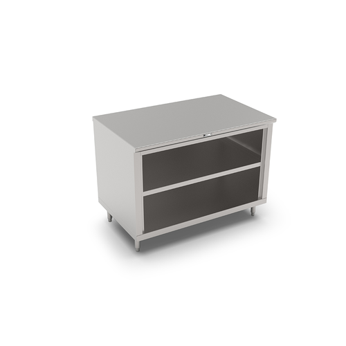 Work Table, cabinet base with open front, 48"W x 36"D, 16/300 stainless steel flat top, Stallion Safety Edge front, (1) midshelf, 18/430 stainless steel wrap, stainless steel legs with adjustable feet, NSF