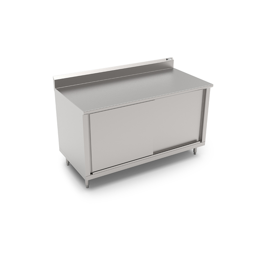 Work Table, cabinet base with sliding doors, 84"W x 30"D, 14/300 stainless steel top with 5" backsplash, Stallion Safety Edge front, (1) midshelf, 18/430 stainless steel body, stainless steel legs with adjustable feet, NSF