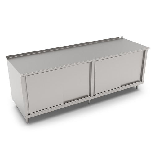 Work Table, cabinet base with sliding doors, 96"W x 24"D, 16/300 stainless steel top with 1-1/2" rear up-turn, Stallion Safety Edge front, (1) midshelf, 18/430 stainless steel body, stainless steel legs with adjustable feet, NSF