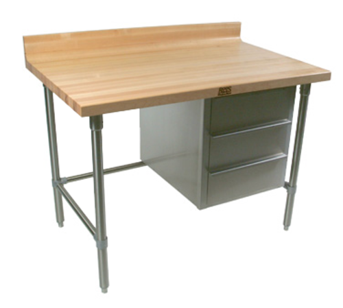 Baker's Table, 84"W x 30"D, 1-3/4" thick top with 4" coved riser on back, Northern Hard Rock Maple, with penetrating oil finish, open cabinet base with (3) drawers, stainless steel bracings, legs, & bullet feet, NSF, KD