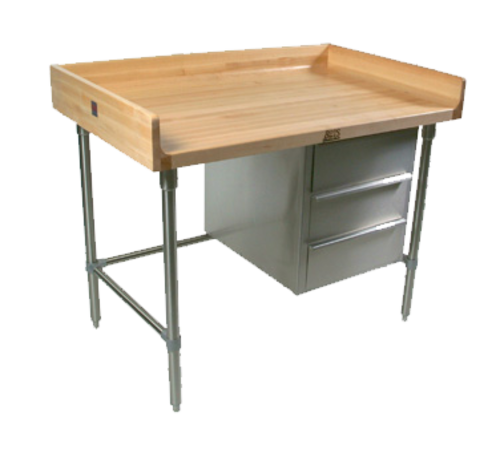 Baker's Table, 72"W x 30"D, 1-3/4" thick top with 4" coved riser on back & both ends, Northern Hard Rock Maple, with penetrating oil finish, open cabinet base with (3) drawers, stainless steel bracings, legs, & bullet feet, NSF, KD