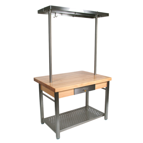 Cucina Grande' Work Table, 60"W x 36"D x 35"H overall size, 2-1/4" thick edge grain flat top, Northern Hard Rock Maple with Varnique finish, perforated 18/300 stainless steel undershelf, (1)stainless steel front dovetailed drawer, (2) stainless steel towel bars, (1) 8" drop leaf rear mounted, adjustable feet, KD