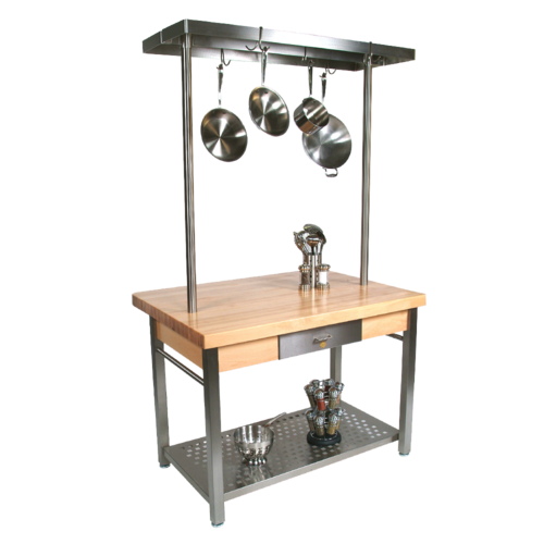 Cucina Grande' Work Table, 48"W x 28"D x 35"H overall size, 2-1/4" thick edge grain flat top, Northern Hard Rock Maple with Varnique finish, perforated 18/300 stainless steel undershelf, (1)stainless steel front dovetailed drawer, (2) stainless steel towel bars, adjustable feet, KD