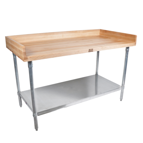 Work Table, baker's top, 120"W x 24"D, 1-3/4" thick top with 4" coved riser on back & both ends, Northern Hard Rock Maple, galvanized steel adjustable undershelf, legs, & bullet feet, NSF, KD