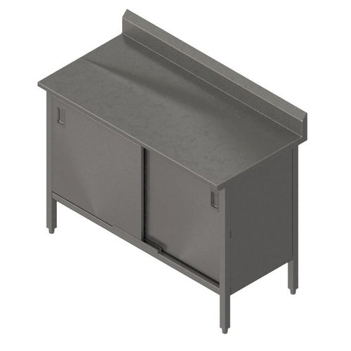 Work Table, cabinet base with hinged doors, 120"W x 30"D, 14/300 stainless steel top with 5" backsplash, Stallion Safety Edge front, 90° turndown on sides, stainless steel base, undershelf, & 1" adjustable bullet feet, all welded set-up, NSF