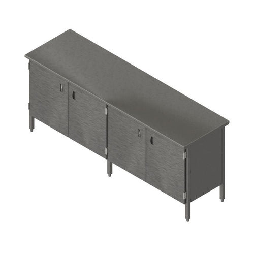 Work Table, cabinet base with hinged doors, 96"W x 24"D, 16/300 stainless steel flat top, Stallion Safety Edge front & back, 90° turndown on sides, stainless steel base, undershelf, & 1" adjustable bullet feet, all welded set-up, NSF
