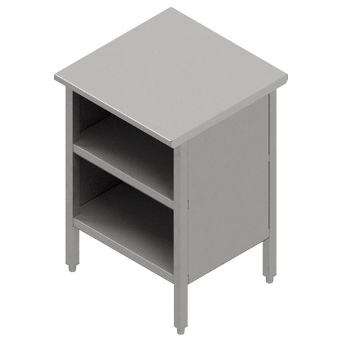 Work Table, cabinet base with open front, 72"W x 30"D, 16/300 stainless steel flat top, Stallion Safety Edge front & back, 90° turndown on sides, stainless steel base, undershelf, & 1" adjustable bullet feet, all welded set-up, NSF (image shown with optional midshelf)