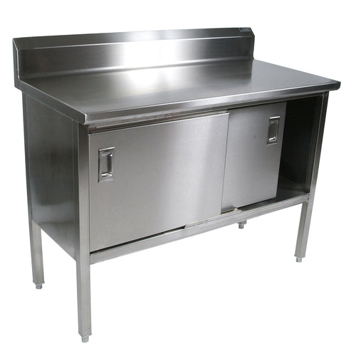 Work Table, cabinet base with sliding doors, 132"W x 24"D, 14/300 stainless steel top with 5" backsplash, Stallion Safety Edge front, 90° turndown on sides, stainless steel base, undershelf, & 1" adjustable bullet feet, all welded set-up, NSF