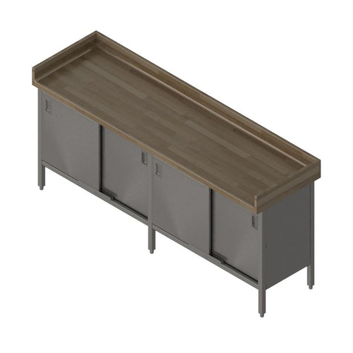 Work Table, cabinet base with sliding doors, 96"W x 30"D x 40-1/2"H overall size, 1-3/4" thick edge grain top with 4" coved riser on back & both ends, laminated Northern Hard Rock Maple, stainless steel base, undershelf, & 1" adjustable bullet feet, all welded set-up, NSF