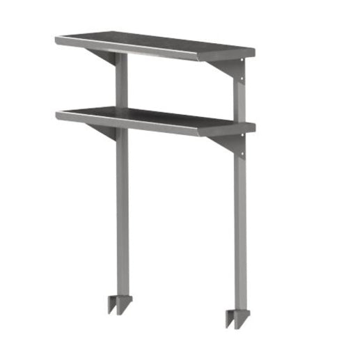Overshelf, cantilevered, double, 132"W x 12"D, 16/300 stainless steel flat top, mounted 18" above table top, 12" between shelves, 1-1/2" stainless steel C-channel upright, KD, NSF