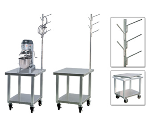 Mixer Stand, 29"W x 23"D x 28"H, 16 gauge stainless steel top with marine edge, stainless steel undershelf, 70"H accessory tree with (5) hangers, 5" swivel casters (2) braked, Made in USA