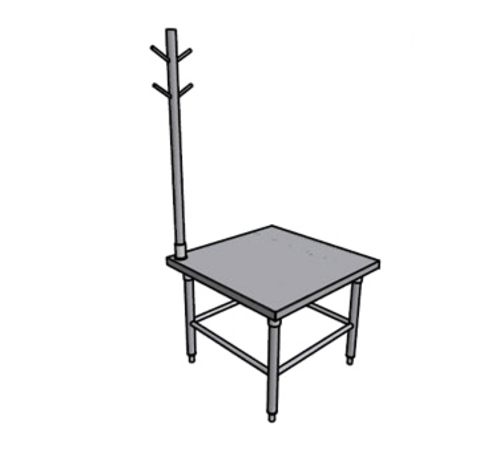 Equipment Stand, 30"L x 30"W x 18"H, 16/304 stainless steel top, corner utensil tree, 14 gauge galvanized "HAT" channels, stainless tube stretchers welded to (4) each 1-5/8" stainless tube legs with stainless adjustable feet, fully assembled NSF
