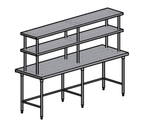 Spec Line Work Table with Overshelf, 114"W x 30"D, Flat Top Island Series, 14/304 stainless top with 2" turned down on 4-sides, single 18" wide overshelf, 14 gauge galvanized "HAT" channels, stainless tube stretchers welded to (6) each 1-5/8" stainless tube legs with stainless adjustable feet