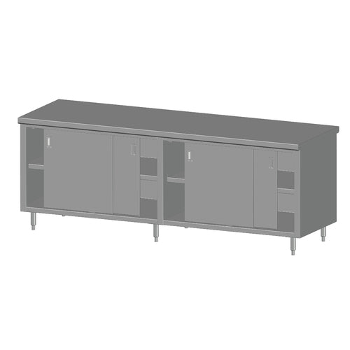 Universal Stainless Work Table, cabinet base with sliding doors, 120"W x 24"D, 16/300 series stainless steel top, without splash, stainless steel cabinet, with mid-shelf, mounted on 6" legs with adjustable bullet feet, NSF