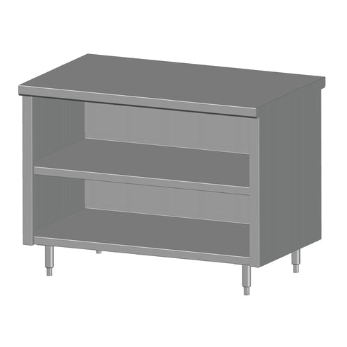 Universal Stainless Work Table, cabinet base with open front, 48"W x 24"D, 16/300 series stainless steel top, stainless steel cabinet, with mid-shelf, mounted on 6" legs with adjustable bullet feet, NSF