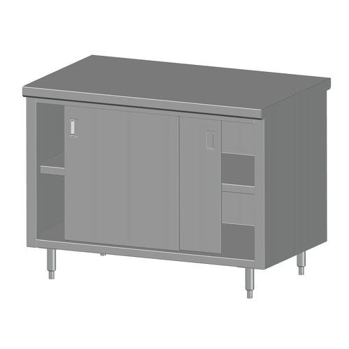 Universal Stainless Work Table, cabinet base with sliding doors, 72"W x 24"D, 16/300 series stainless steel top, without splash, stainless steel cabinet, with mid-shelf, mounted on 6" legs with adjustable bullet feet, NSF
