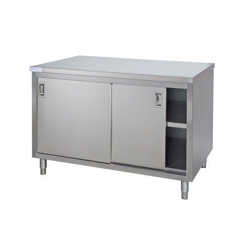 Servery Work Table, Cabinet with sliding doors, 42"W x 30"D, flat top with H-style hat channels, (2) sliding doors, adjustable intermediate shelf, reinforced frame, full welded stainless steel construction, 6" adjustable stainless steel legs
