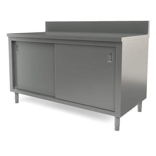 Servery Work Table, Cabinet with sliding doors, 60"W x 30"D, flat top with H-style hat channels, 6"H backsplash, (2) sliding doors, adjustable intermediate shelf, reinforced frame, full welded stainless steel construction, 6" adjustable stainless steel legs