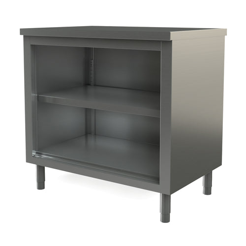 Servery Work Table, open front Cabinet, 36"W x 24"D, flat top with H-style hat channels, adjustable intermediate shelf, reinforced frame, full welded stainless steel construction, 6" adjustable stainless steel legs