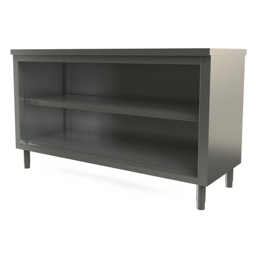 Servery Work Table, open front Cabinet, 60"W x 24"D, flat top with H-style hat channels, adjustable intermediate shelf, reinforced frame, full welded stainless steel construction, 6" adjustable stainless steel legs