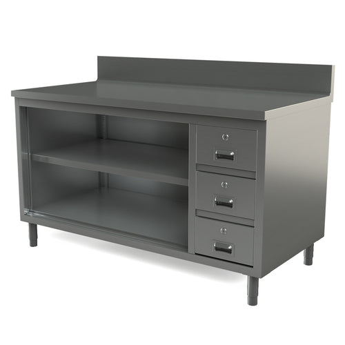 Servery Work Table, open front Cabinet, 60"W x 30"D, flat top with H-style hat channels, 6"H backsplash, (3) drawers with locks & full extension slides, adjustable intermediate shelf, reinforced frame, full welded stainless steel construction, 6" adjustable stainless steel legs