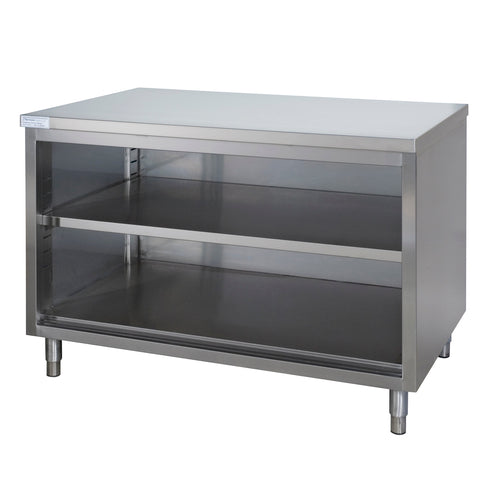 Servery Work Table, open front Cabinet, 84"W x 30"D, flat top with H-style hat channels, adjustable intermediate shelf, reinforced frame, full welded stainless steel construction, 6" adjustable stainless steel legs