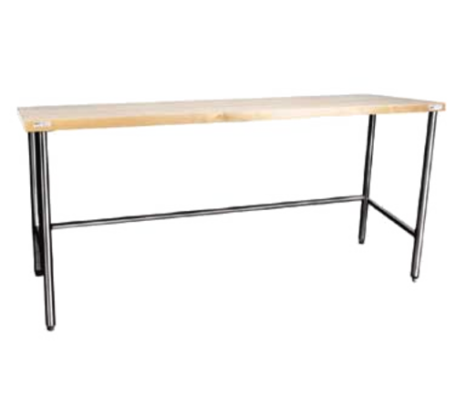Work Table, 60"W x 36"D x 34"H, open bar style, 3/4" hard laminated maple wood top with edge grain electronically bonded, 16 gauge stainless steel construction, open with cross-rails & stainless steel legs with clad bullet feet, backsplash 90 degree up-turn, no return, NSF
