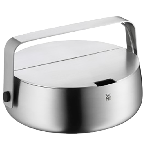 Bar Sugar Bowl, 5-3/4" dia. x 3-1/3"H, with handle, tilt lid, with spoon recess, Cromargan® 18/10 stainless steel, matt finish, Barista by WMF