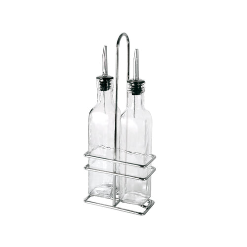 Oil/Vinegar Cruet Set, 8 oz., (2) lead free glass cruet with stainless steel pourer, (1) chrome rack(QTY break = 12 sets)
