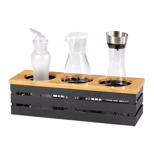 Curator™ Beverage/Dressing Display, 19-1/2" x 6-3/4" x 5-1/2", 3-compartment bamboo lid with 4-3/4" dia. opening, includes: ice guard insert, powder coated steel, metal gray (fits BW-1892 decanter, GL-CRF-40 decanter, & SDB-32 dressing bottles)