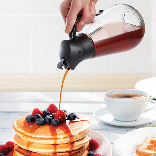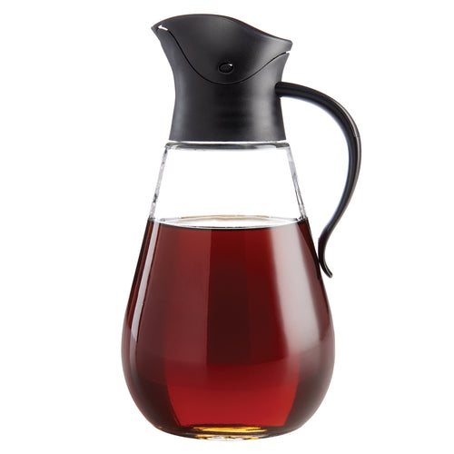 The World's Greatest™ Store'N Pour Syrup Dispenser, 18-1/2 oz., built-in spout, silicone gasket, black plastic top & handle, glass jar