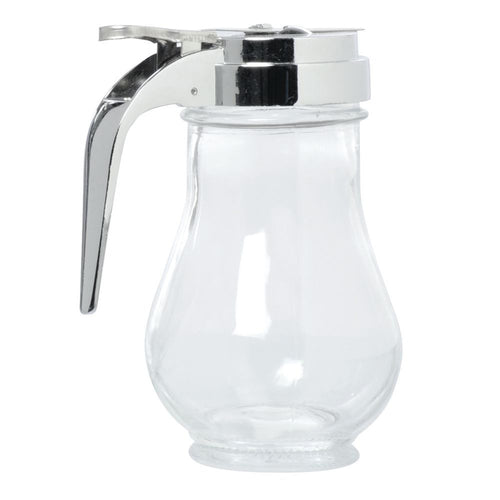 Syrup Dispenser, 6 oz., 4" x 3" x 4-3/4", teardrop glass container, chrome-plated flat zinc top & handle, clear