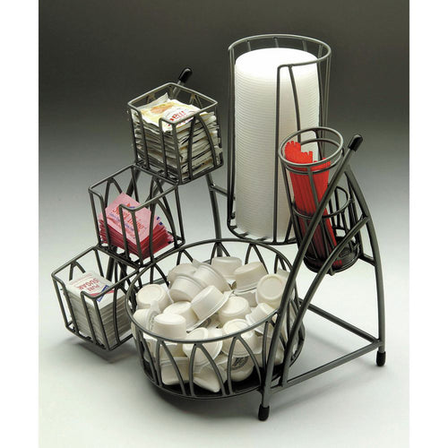ARCtistic Condiment Holder/Organizer, 6-section, 10" x 10" x 11-3/4"H, includes: Sugar/Tea Packet Compartment: 3" x 2-1/2"; Lid or Cup Holder: 4" dia. x 7"H; Straw Holder: 1-7/8" dia. x 5"H; Creamer or Plate Holder: 5-9/16" dia. x 2-5/8", with feet, powder-coated metal wire, flint finish