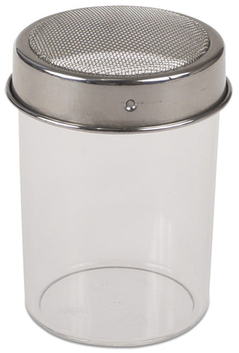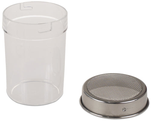 Shaker, 10 oz. capacity, 4-1/4"H, for powdered sugar, stainless mesh lock top lid, plastic
