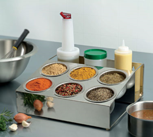 Spice Roll Box, (6) 16 oz. hemispheric bowls with slanted supporting base, rear compartment for (4) pouring bottles, plexiglass lids, stainless steel, made in France