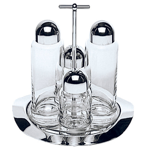 Cruet & Salt Cellar Set, 5-piece, includes: (2) 6 oz. glass cruets & (2) 3-3/4 oz. glass cellars, 7-7/8"H and (1) 18/10 stainless steel caddy, dishwasher safe, Millennium
